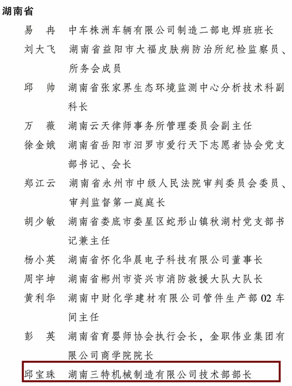 • 為表彰先進(jìn)、樹立榜樣,進(jìn)一步引領(lǐng)和激勵(lì)廣大婦女堅(jiān)定不移聽黨話、跟黨奮進(jìn)新征程,豪情滿懷、意氣風(fēng)發(fā)投入推進(jìn)中國式現(xiàn)代化的偉大實(shí)踐,日前,全國婦聯(lián)決定授予10人全國三八紅旗手標(biāo)兵稱號,298人全國三八紅旗手稱號,授予199個(gè)單位全國三八紅旗集體稱號,其中,來自桃源的湖南三特機(jī)械制造有限公司技術(shù)部部長 邱寶珠 獲得全國三八紅旗手榮譽(yù)。